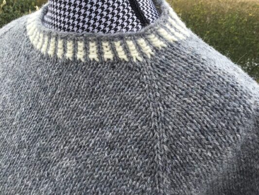 Trøjen kan også sagtens strikkes til mænd – blot med en alm ribkant.