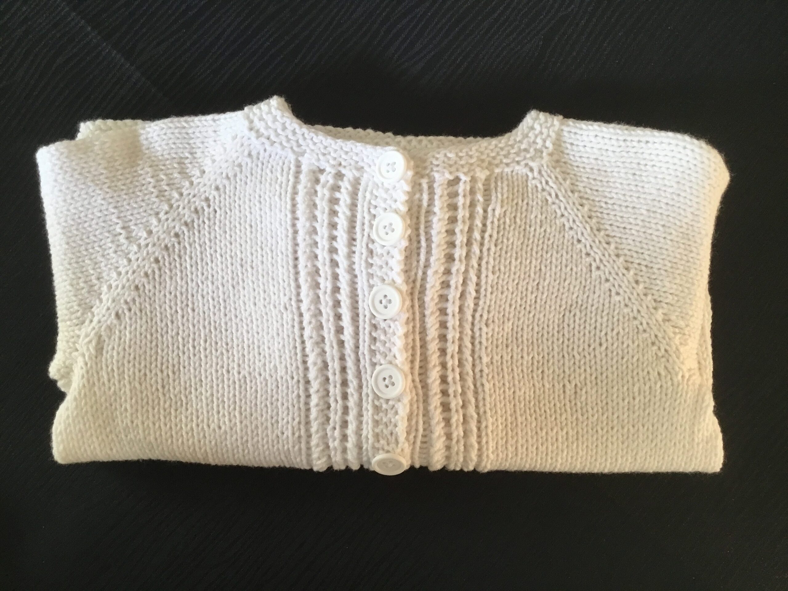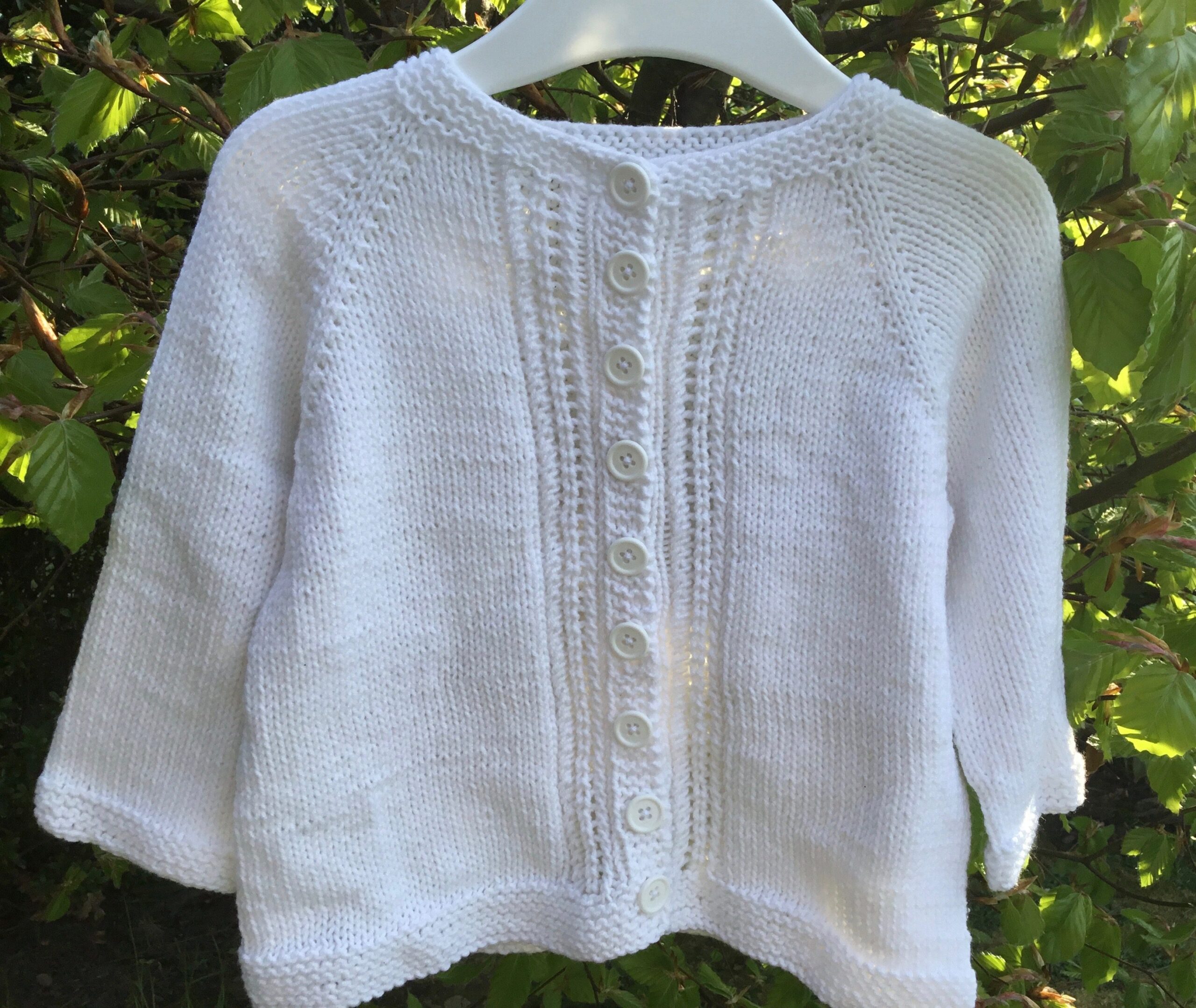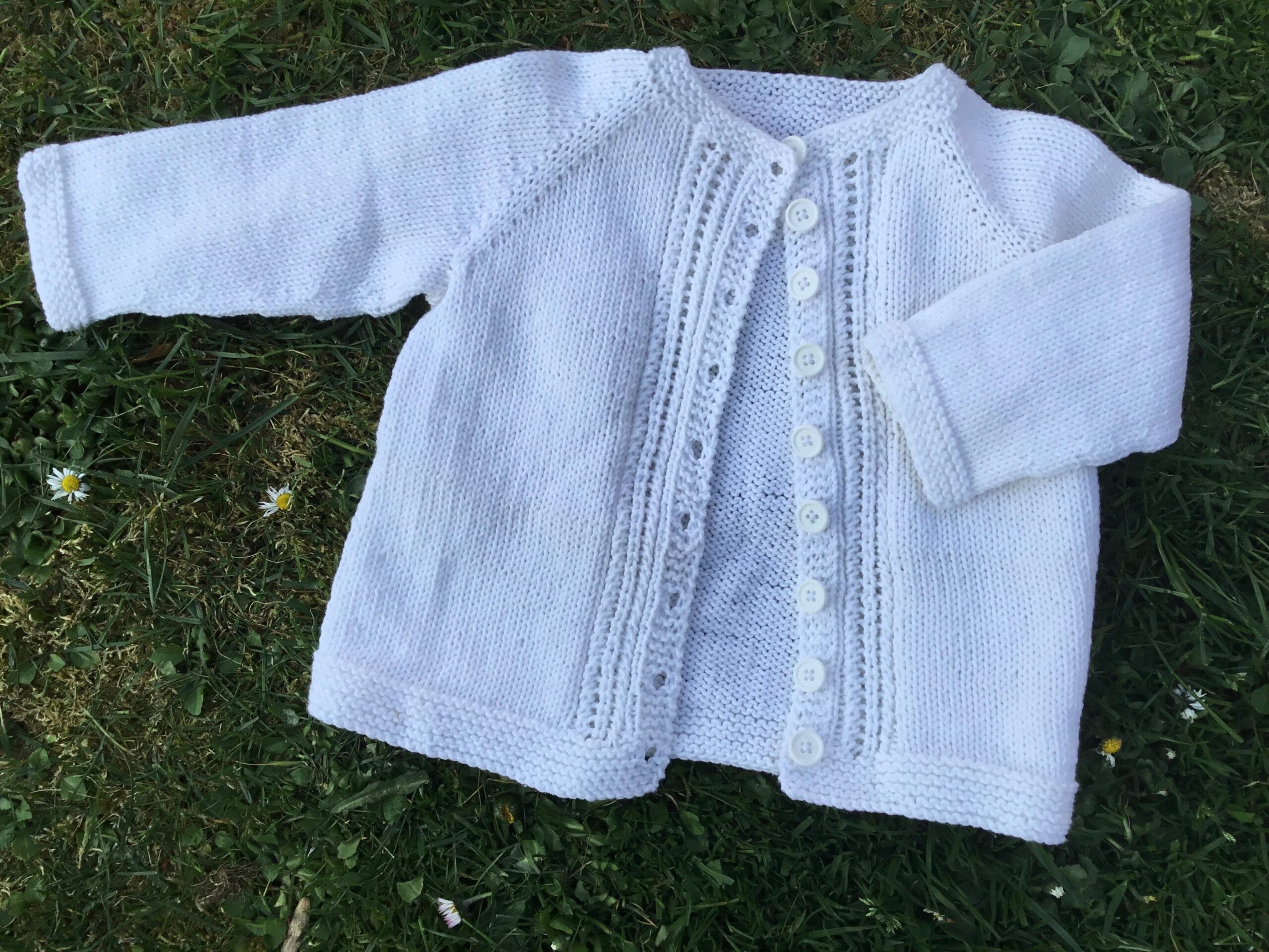 Et lille let 2 pindshulmønster ned langs knaplukningen gør den ekstra feminin. Knaplukningen strikkes samtidig. Så der er ingen sammensyninger eller opsamling af kantmasker efterfølgende. Kun få ender at hæfte, når cardiganen er færdig.