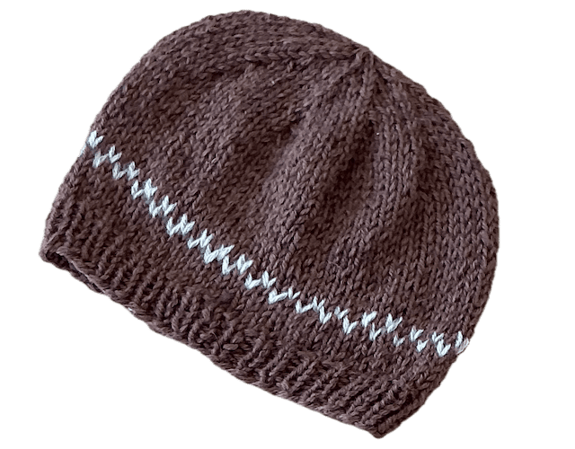 Den kan naturligvis også strikkes helt ensfarvet eller med almindeligt stribemønster. Halsudskæringen formes vha. vendepinde.
